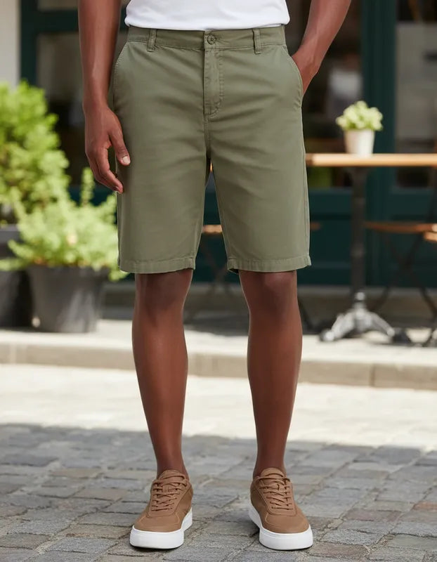 A bermuda chino é confeccionada em uma combinação de algodão e elastano.