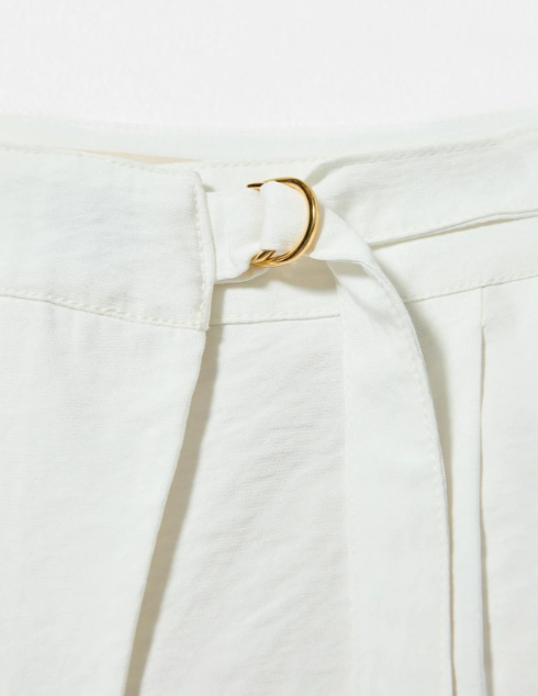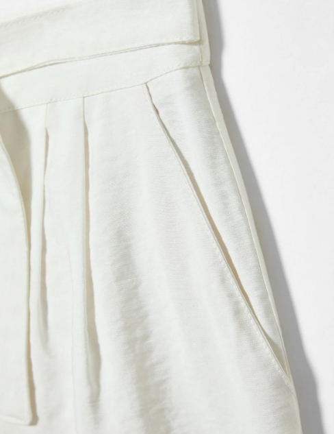 O destaque da peça é o cós transpassado, com fivela de metal e faixa do próprio tecido, adicionando charme e diferencial ao design. As pregas frontais garantem elegância, enquanto os bolsos laterais e posteriores trazem praticidade para o dia a dia.