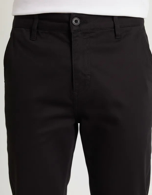 A calça é confeccionada em tecido plano de algodão e elastano. A peça possui bolsos frontais do tipo faca, bolsos embutidos posteriores, passantes no cós, aplicação de placa de porcelana oval na parte posterior e fechamento frontal por zíper e botão.