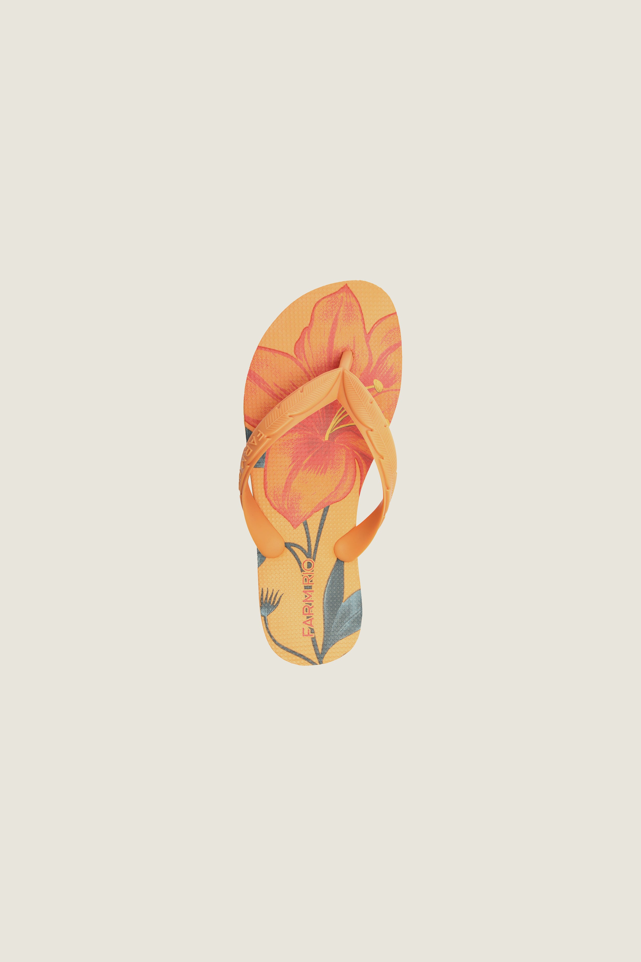 Palmilha com estampa exclusiva Farm, formato tradicional, o rainbow tem a tira injetada em PVC com aplicação de textura de folha e inscrição do logo Farm Rio.