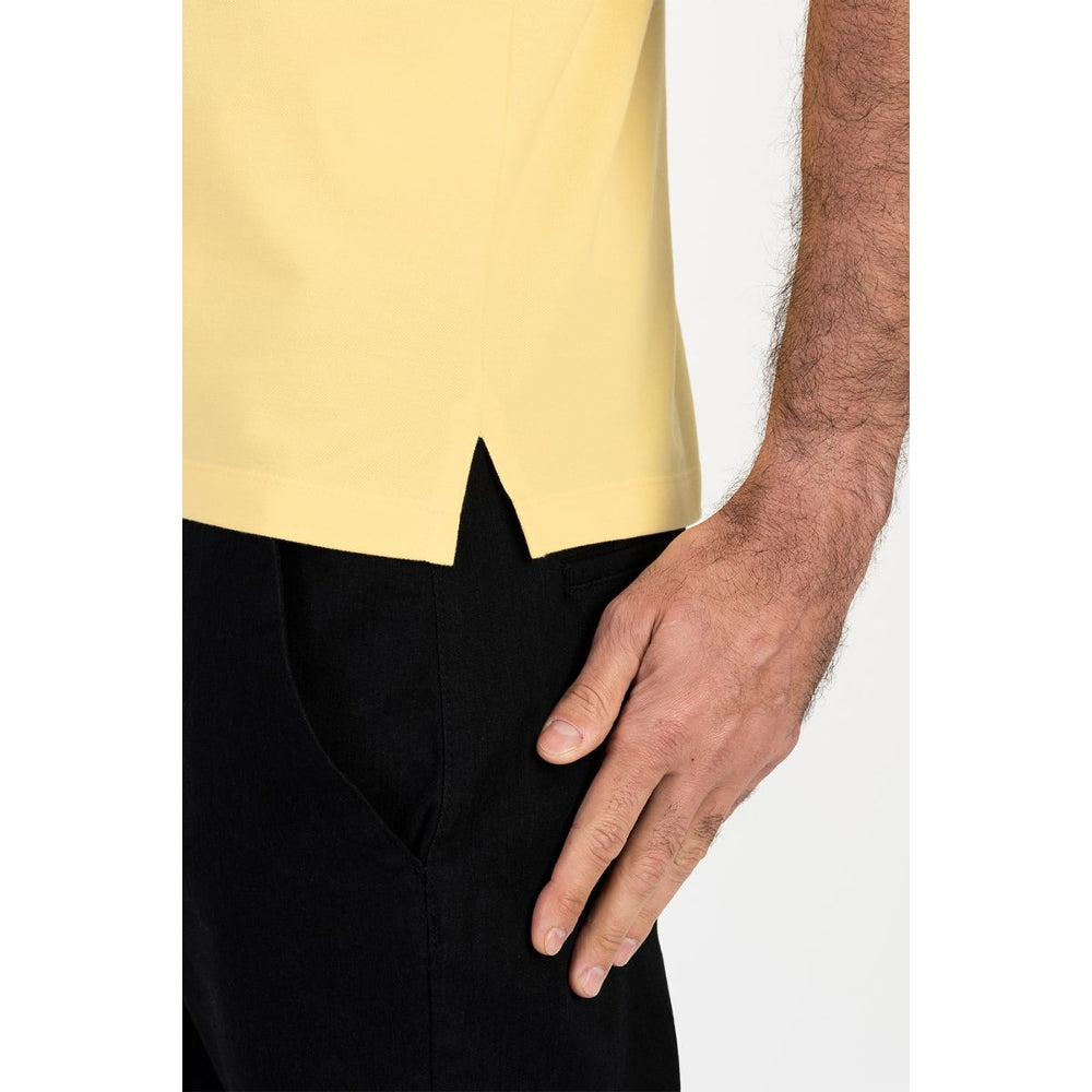 A peça possui gola colarinho com abotoamento, mangas curtas, detalhe com o logo da marca bordado na altura do peito e acabamentos em malha canelada.