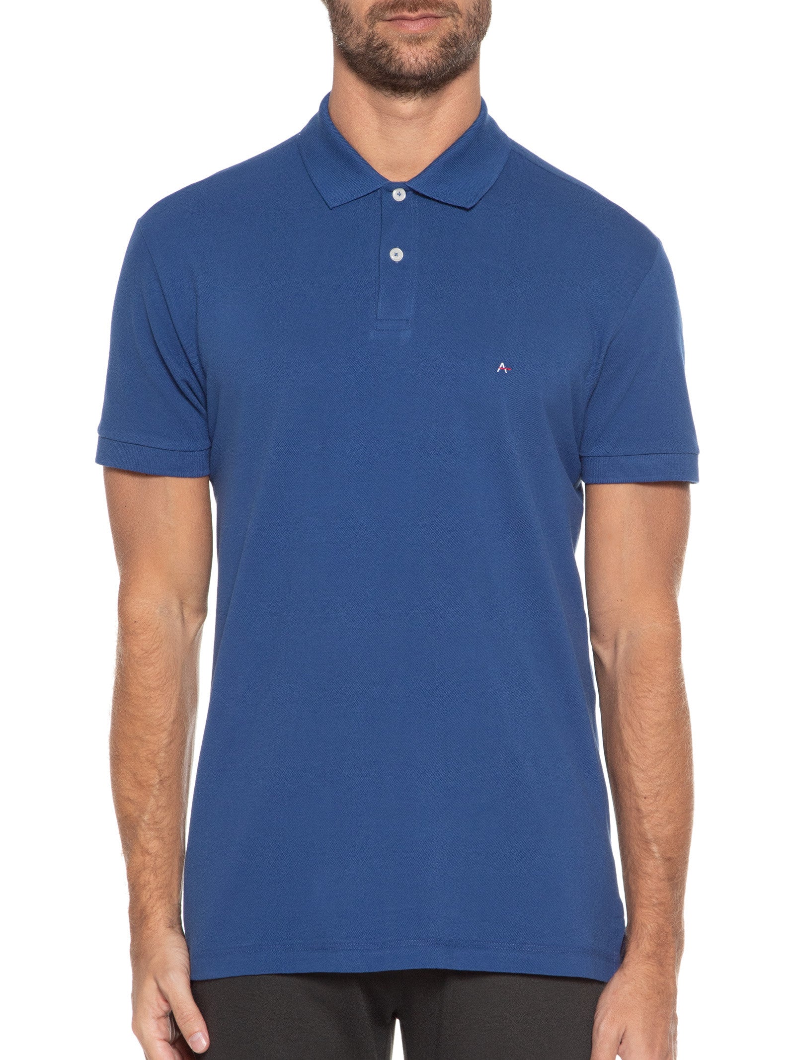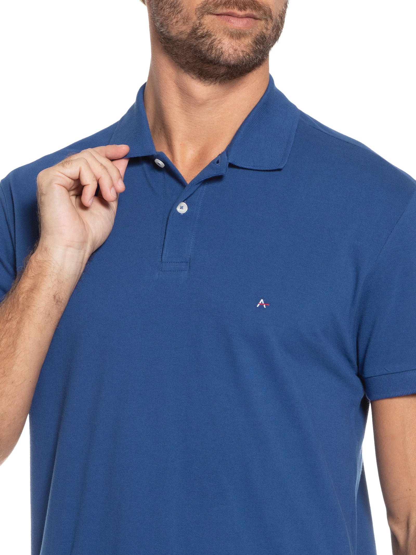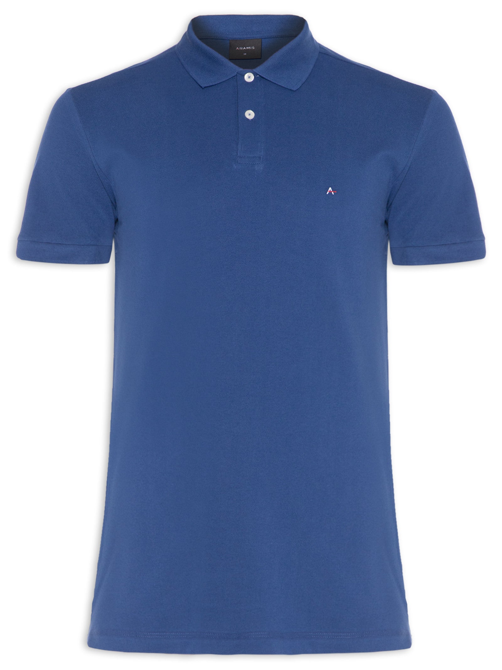 A polo azul é confeccionada em malha piquet. A peça possui gola esporte com botões aplicados, mangas curtas, acabamento canelado na gola e nas mangas, fendas laterais curtas, logo da marca bordado em cores contrastantes na altura do tórax, shape solto, caimento reto e acabamento pespontado.