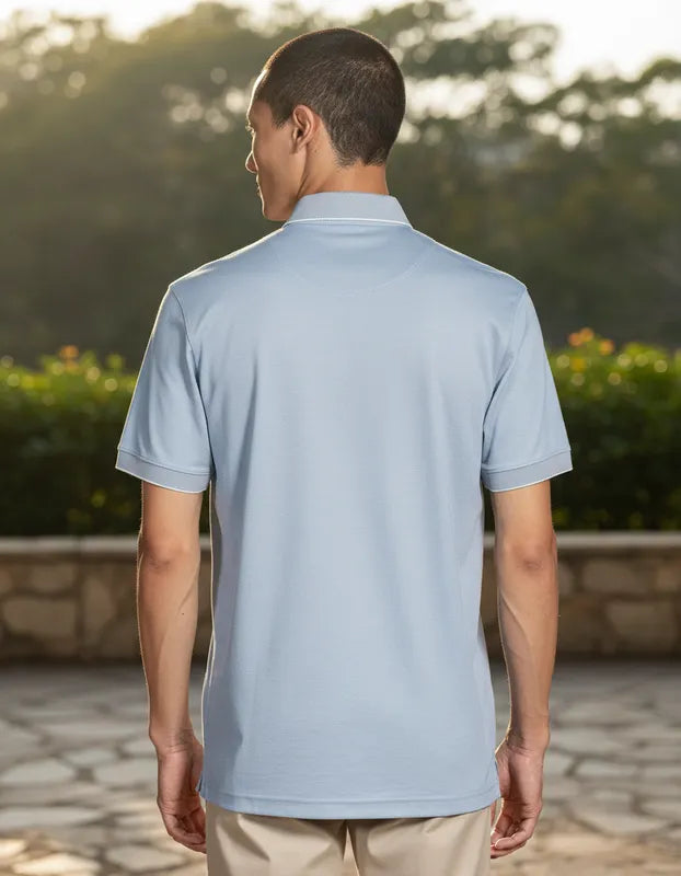 A polo é confeccionada em uma combinação de poliéster e algodão, tecido tecnológico, modelagem regular. A peça possui gola colarinho com abotoamento, logo da marca em relevo na altura do peito do lado esquerdo, mangas curtas e frisos mais claros na gola e mangas.