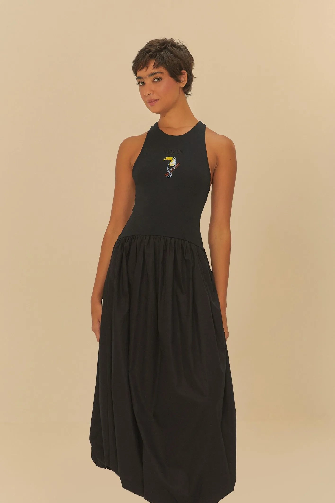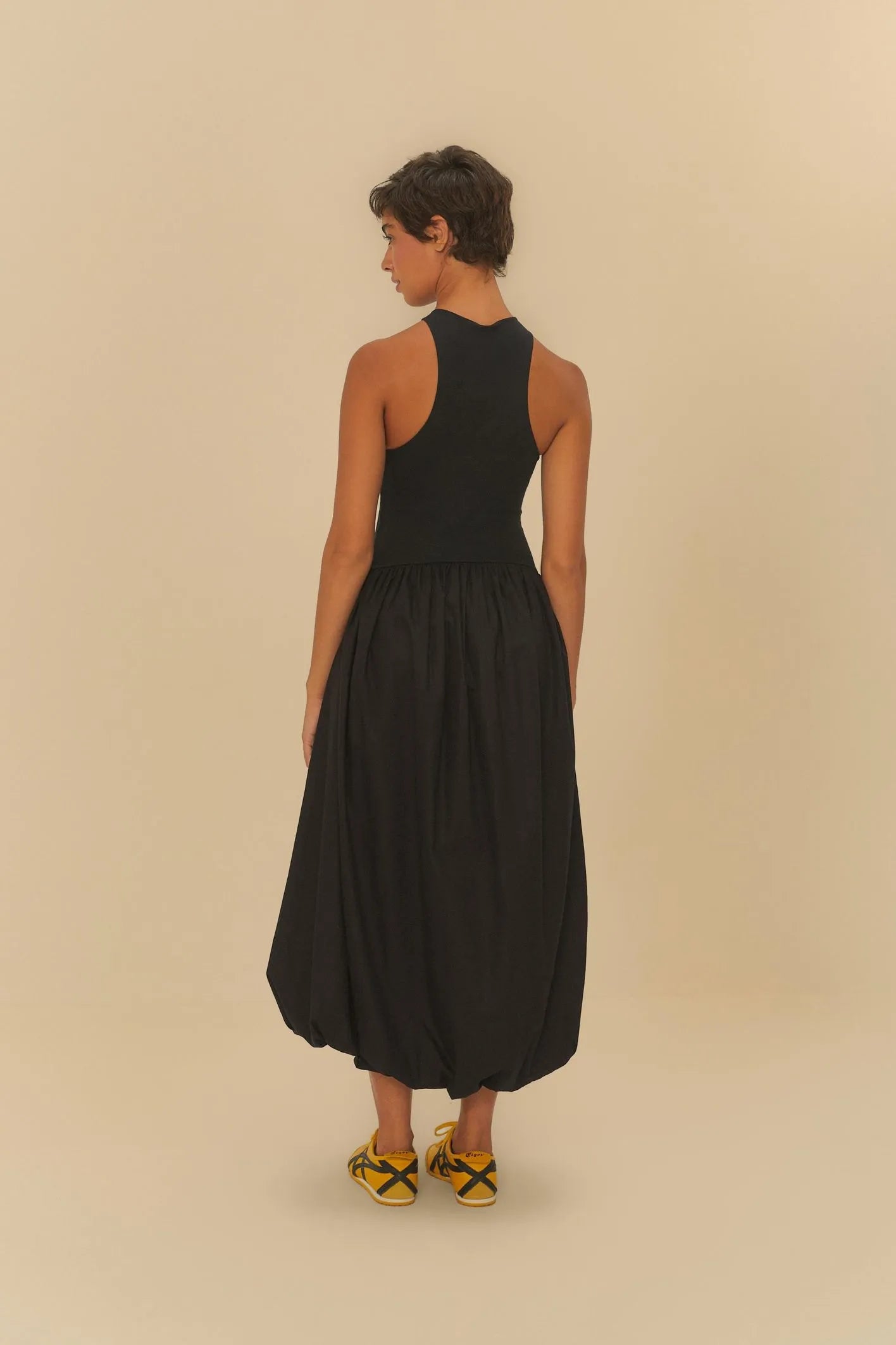 A saia balonê confere um charme único e descomplicado à peça.