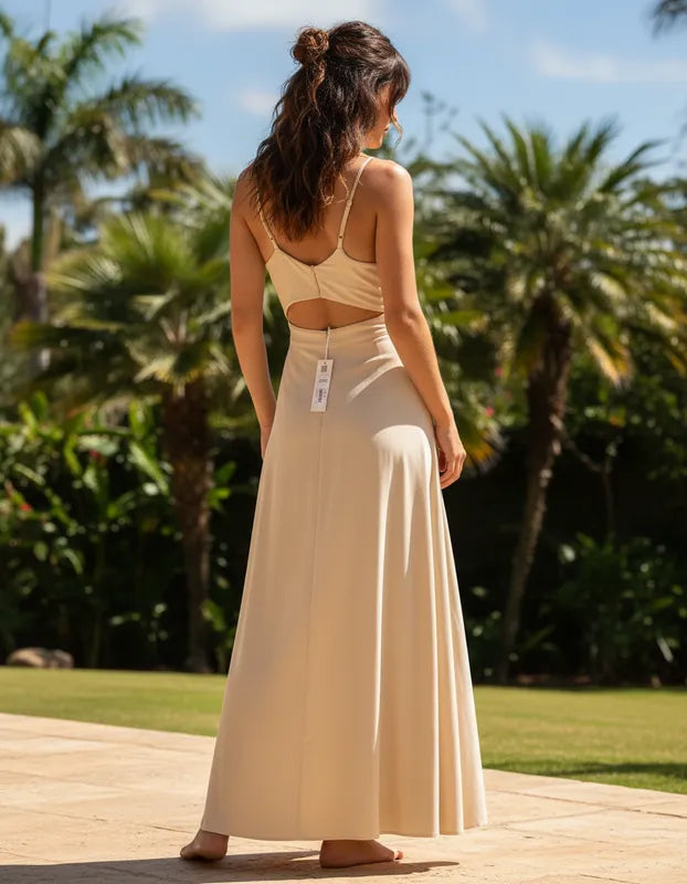 Vestido longo de viscose, na frente tem decote "V" com recorte abaixo do busto e fenda no centro. As costas tem recorte, zíper invisível, alças finas e regulaveis.